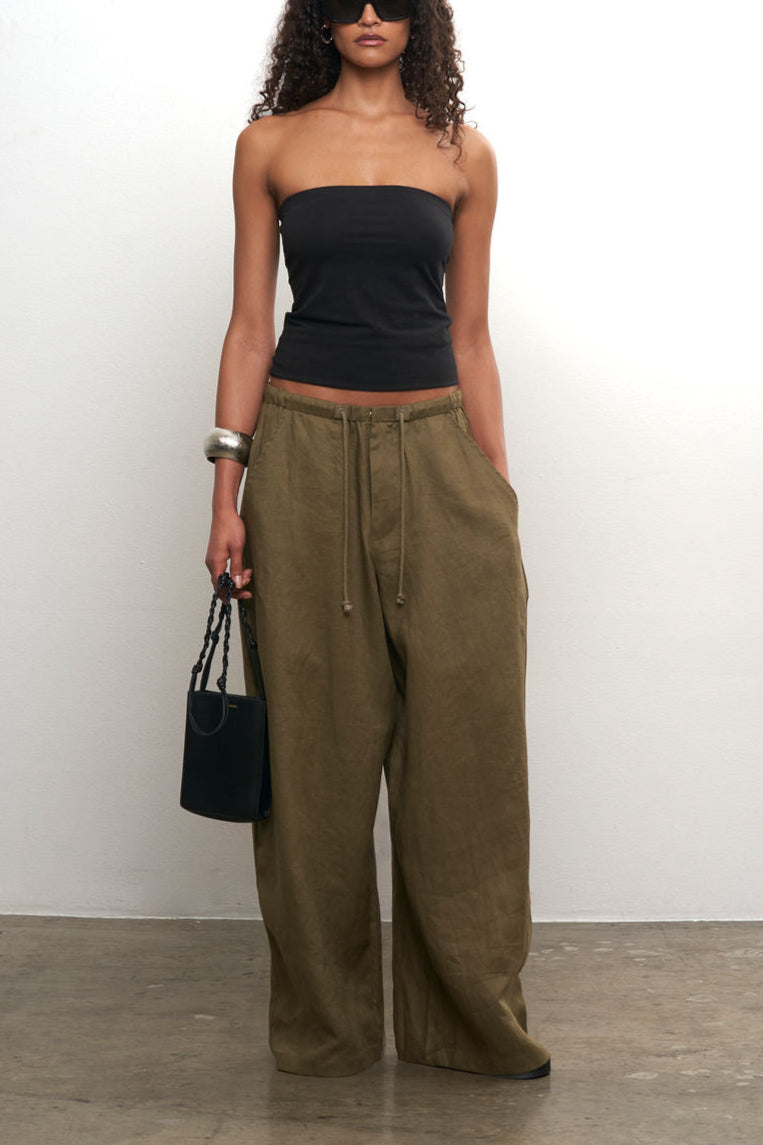 A soft baggy silhouette with a dropped crotch and wide leg. Cut in 100% linen with a gathered waist.  Finished with a drawstring and invisible zipper for an easy, relaxed fit. Lightweight and breathable for daily wear. Styling tip: balance with fitted tops or lean into full-volume layering.