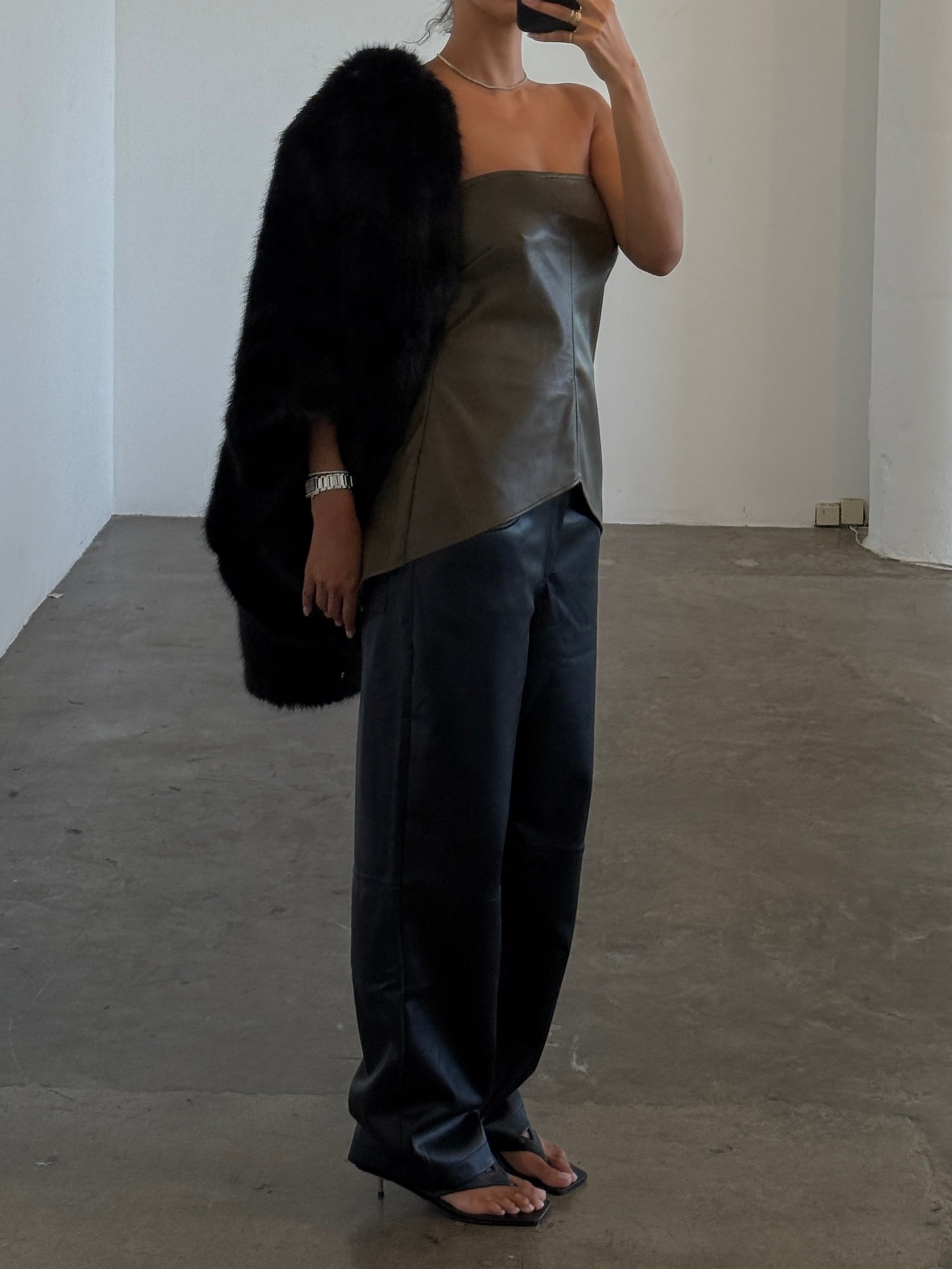 Introducing the Back Slit Bandeau – a bold, strapless design crafted from soft yet structured vegan leather. This sleek piece features a minimalist tube-style bodice with a unique back slit and pointed front hem, adding a modern edge that makes it a versatile wardrobe hero. Perfect for layering or wearing solo, it transitions effortlessly from day to night, pairing beautifully with wide-leg trousers or tailored skirts for any occasion.